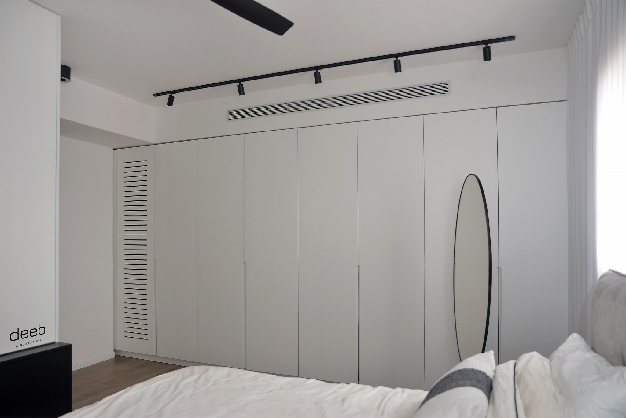 הריהוט בחדר השינה מתאים לסגנון מודרני עם קווים נקיים ומראה מודרני. ארונות התלבשות ומדפים מובנים בצורת מסגרת עם פריטים אחסון נסתרים. השידות והשולחנות בחדר השינה מעוצבים בצורה פשוטה ומודרנית עם ידיות מתכתיות או בגימור מבריק.
