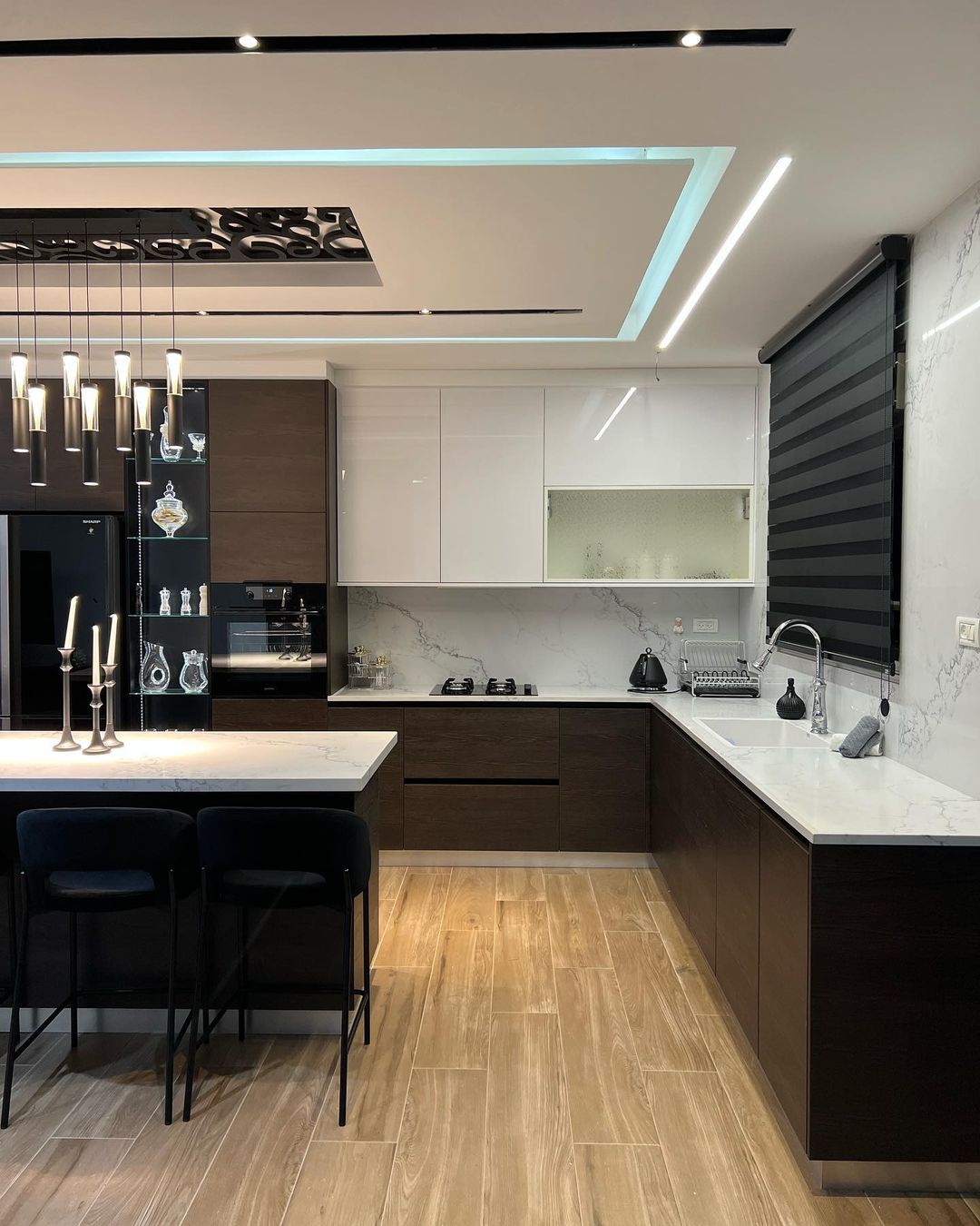 קווים נקיים וגימורים מודרניים: מטבחים מעוצבים מודרנים מתאפיינים בקווים מתקדמים ונקיים. הם משתמשים בגימורים חלקים, משטחים מבריקים וחומרים מודרניים כמו הזכוכית, המתכת והאבן.